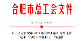 近日,合肥市总工会发布了《关于认定合肥市2023年度职工创新竞赛优胜选手“合肥市金牌职工”的通报》,合变公司...